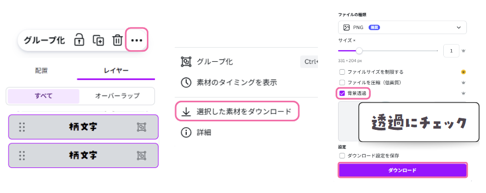 2-2.レイヤーから重ねた文字を選択し、・・・から「選択した素材をダウンロード」→ 透過PNGでダウンロード。