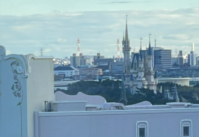 お部屋はエントランス側のようです。窓からはまずスリンキードッグパークが目に入り、駐車場やファンタジースプリングスホテル、リゾートラインの駅も見えます。