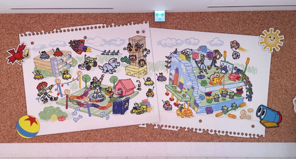 館内にはウッディとバズがモチーフになったエレベーターがあり、階に止まるとそれぞれウッディ、バズの声が流れます。